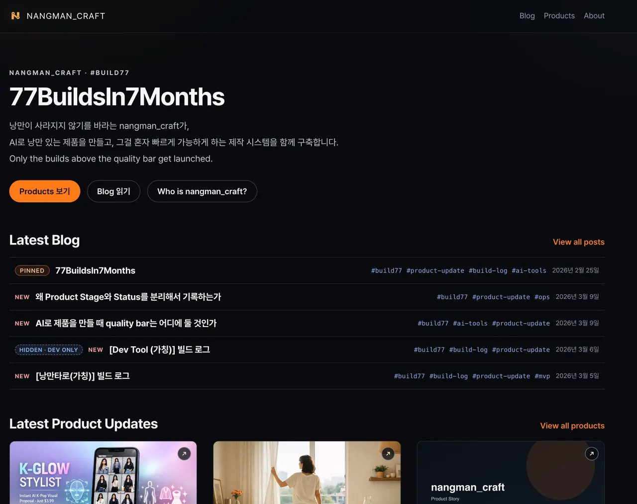 결국 오래 붙들 제품은 화면보다 우선순위에서 드러난다. nangman_craft 같은 core product는 계속 손을 대게 되지만, 그렇지 않은 build는 어느 시점부터 자연스럽게 우선순위에서 밀린다.
