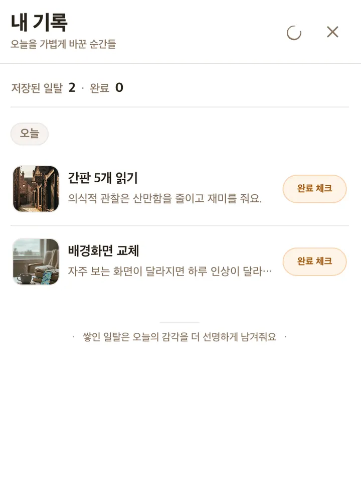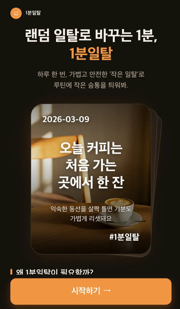 1분일탈은 짧은 행동 제안으로 기분 전환을 만든다.낭만타로는 결과 문구보다 카드 리추얼 감각을 준다.