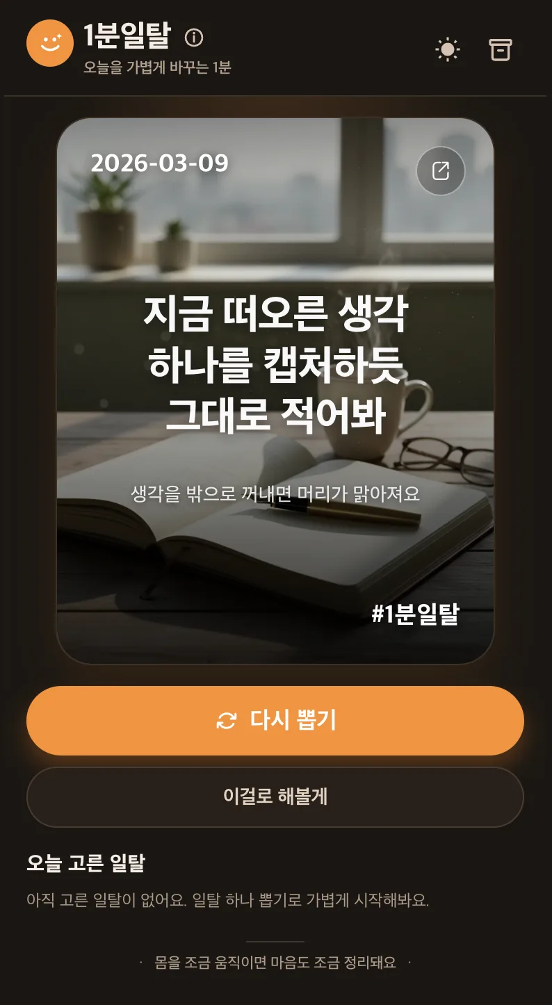 1분일탈의 홈 화면. 한 손으로 빠르게 진입하고, 가벼운 리듬감으로 카드를 뽑는 첫 인상을 만드는 데 집중했다.