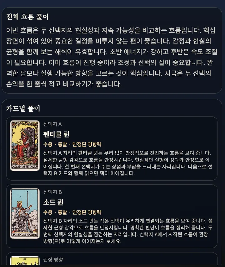 핵심은 결과 문구를 길게 읽게 하는 것이 아니라, 셔플하고 카드를 고르고 뒤집는 짧은 리추얼을 실제로 하는 듯한 감각을 웹에서 만드는 데 있습니다.