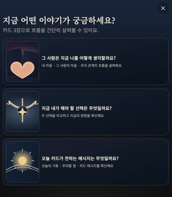 카드를 직접 고르는 순간이 실제 타로를 하는 듯 느껴져야 이 제품의 정체성이 살아난다고 봤고, MVP 단계에서 가장 많은 신경을 쓴 부분도 이 인터랙션이었습니다.